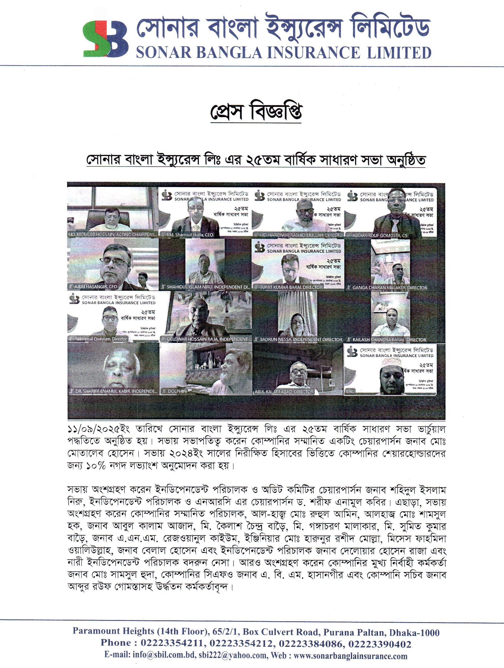 সোনার বাংলা ইন্স্যুরেন্স লিঃ এর ২৫তম বার্ষিক সাধারণ সভা অনুষ্ঠিত