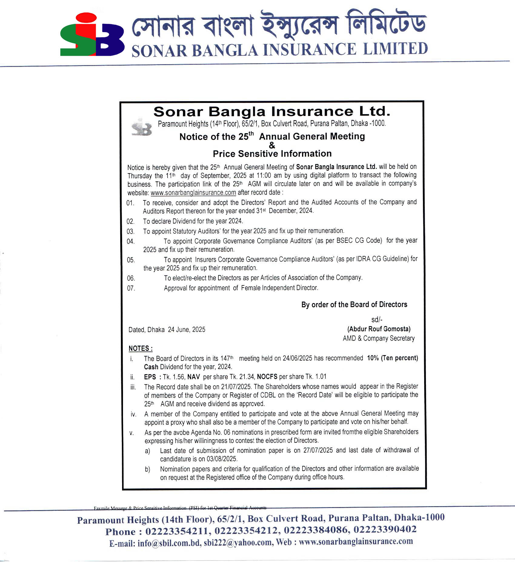 The Credit Rating Result of Sonar Bangla Insurance Ltd is “AA+” and it has been Rated by alpha Credit Rating Ltd.